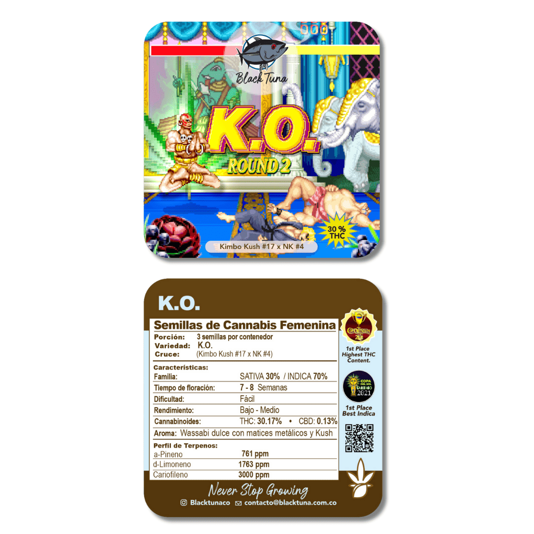 K.O. ist das Ergebnis einer meisterhaften Kreuzung aus Kimbo Kush x Nicole Kush. Diese Sorte kombiniert die besten Eigenschaften moderner Indica-Genetiken – bekannt für ihre harzreiche Produktion, hohe Widerstandsfähigkeit und kompakte, buschige Struktur. Mit ihren intensiven Aromen von Kakao, roten Beeren, Kiefer und süßem Wasabi vereint sie Geschmack und Wirkung auf perfekte Weise..