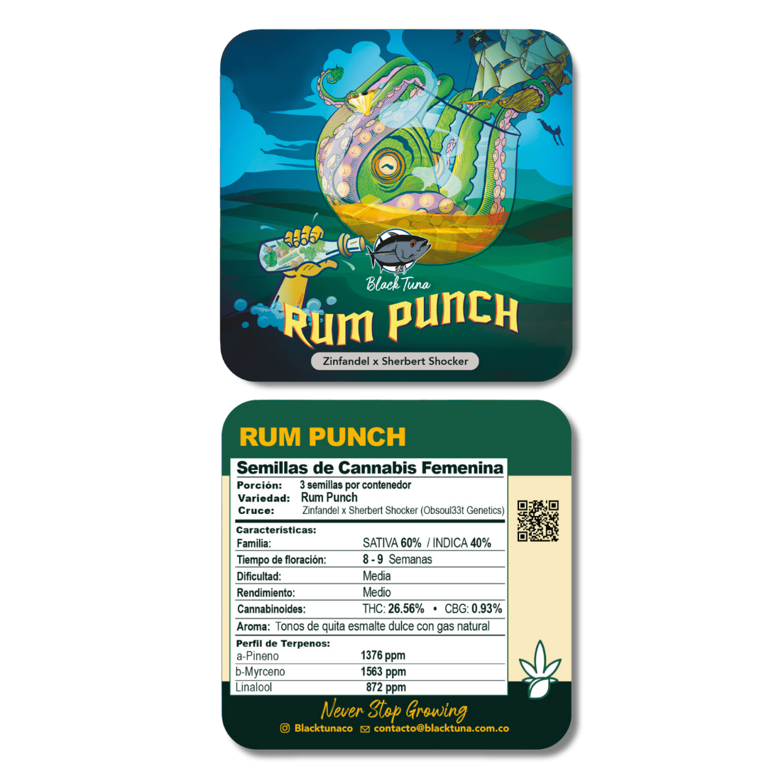 Rum Punch ist eineüberwiegend sativadominierte Sorte, entstanden aus Zinfandel x Samarian Sunset. Diese Genetik kombiniert die intensiven Sour Diesel-Noten aus der Zinfandel-Selektion mit den exotischen und innovativen Aromen der Sherb Shocker von Obsoul33t Genetics. Mit einer Blütezeit von ca. 63 Tagen und einer hohen Harz- und Terpenproduktion gehört sie zu den produktivsten Strains im Black Tuna Portfolio. Ihr Aroma? Süße Nagellack-Noten mit einem Hauch von Gas– unverkennbar und kraftvoll!